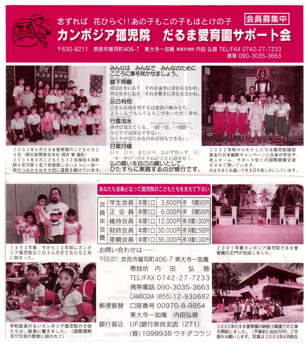 内田氏は、子どもたちにきれいな水を飲んでもらいたいと井戸堀りを開始、逝去されるまでに750本以上の井戸を掘り、住民に提供してきた。 そして、シェムリアップ市内に孤児院「だるま愛育園」を創設、今までに448人の孤児を社会に送り出した。